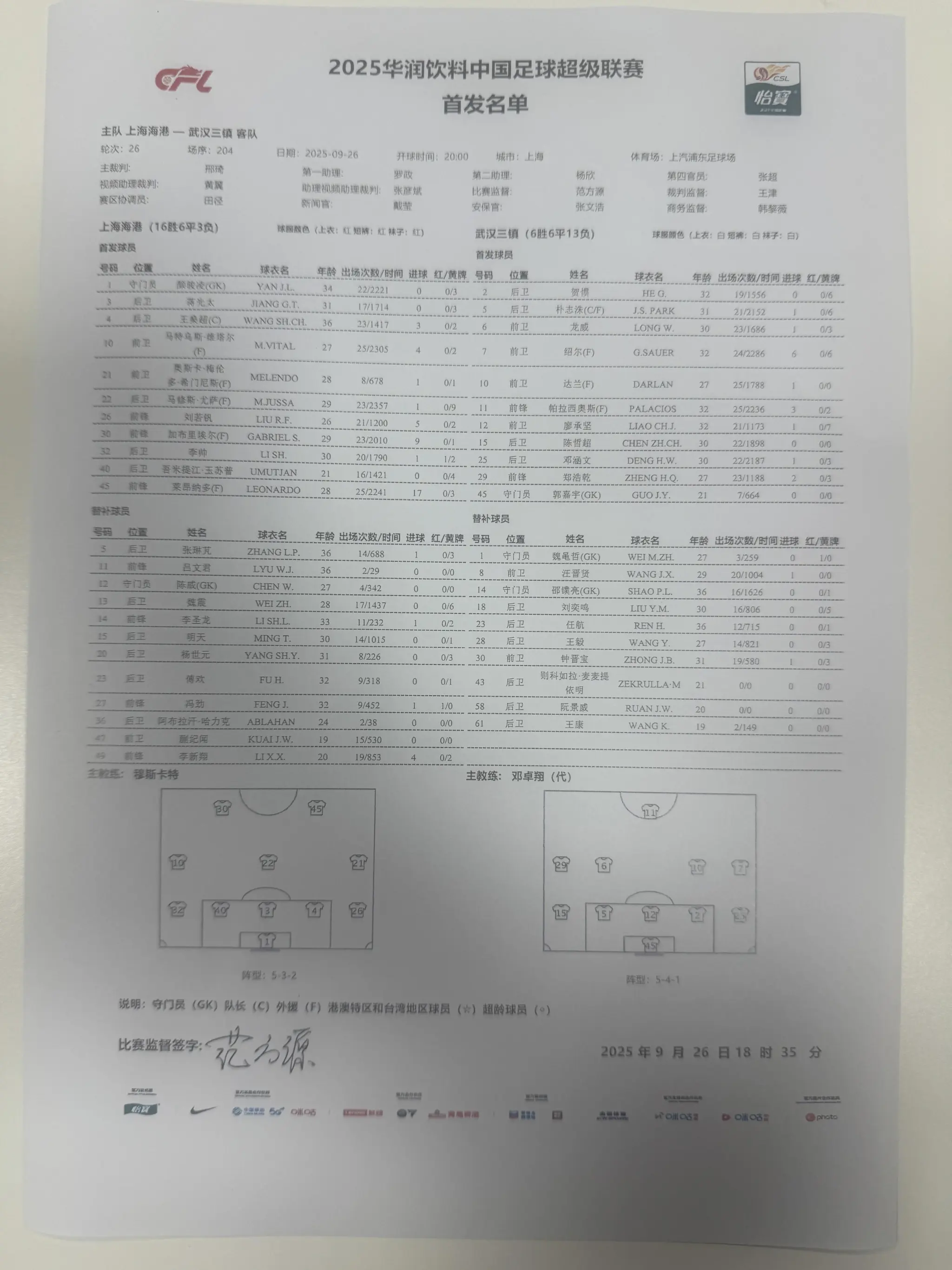 上海海港首发:1-颜骏凌、3-蒋光太、4-王燊超、10-马特乌斯-维塔尔、21-梅伦多、22-马修斯-尤萨、26-刘若钒、30-加布里埃尔、32-李帅、40-吾米提江-玉苏普、45-莱昂纳多